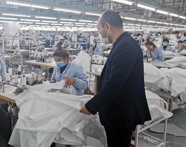 為了生產順利進行,徐亞東首先梳理出哪些員工符合上崗要求,做好溝通,動員返廠。復工后徐亞東與職工并肩作戰,每天穿梭在生產車間,協調組織防護服生產,一直沒有停下忙碌的腳步,加班也成為他的工作常態。