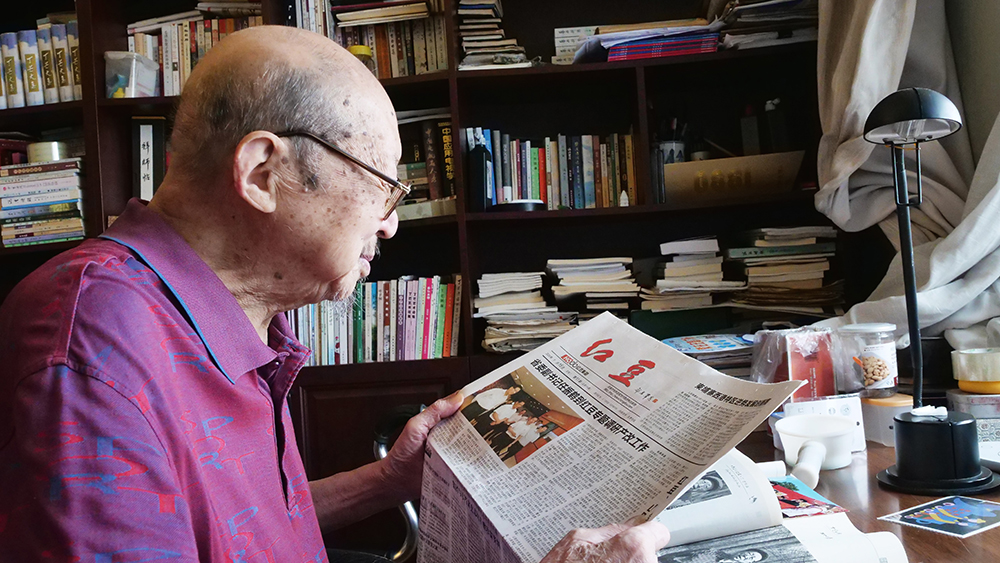 7月29日,今年的七夕前夕,當代著名老詩人、作家、文藝評論家丁芒在家中認真錄制著對紅豆七夕節20周年的祝福視頻。中國當代詩壇曾有“北臧南丁”之說。丁芒,這位從南通城走出來的大詩人,從抗日戰爭的烽火開始生命的吟唱,80載筆墨為伴,書寫了萬余首激蕩人心的詩篇。面對記者的拜訪,丁芒和其夫人都十分熱情。現已96歲高齡的他,看起來依舊面色紅潤,精神飽滿。在丁芒老先生家中,能夠感受到濃濃的文化氣息,書柜上、書桌上擺滿了各種書籍。雖然已是耄耋之年,丁芒老先生依然每天以書籍為精神食糧,在他的身上,我們看到了一個詩人對詩詞的忠貞和熱愛,對傳統文化的敬畏和崇拜。